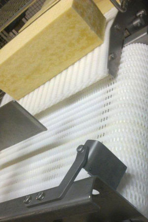 In order to solve a task where blocks of unpacked cheese comes off the cutter, the ScanBelt S.06-401 modular plastic conveyor belt was chosen for the job. A very small transfer was needed in order to secure the geometry of the product.
